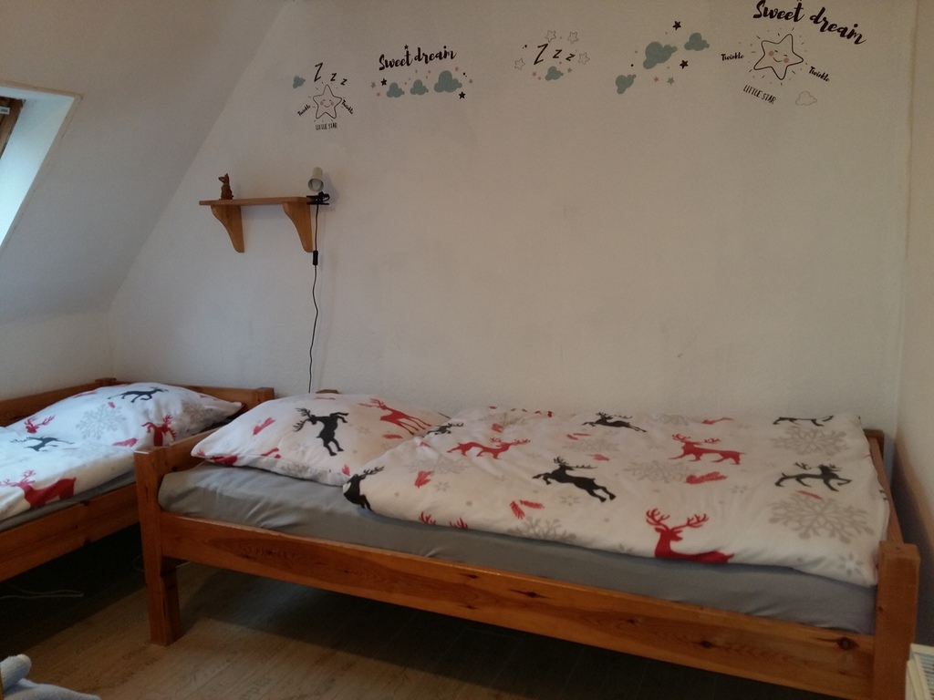 65 qm, max. 5 Personen. 2 separate Schlafräume (1 mal Doppelbett, 1 Einzelbett, 1 Tandembett (alle Länge 2 m und Breite 0,90m), Küche mit Geschirrspülmaschine und Kühl-Gefrierkombination, W-LAN, Wipp Banane, Veluxverdunklungsrollos in den Schlafräumen, Kleinkinderausstattung selbstverständlich